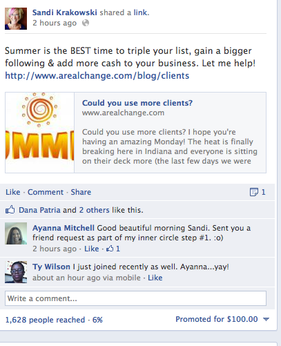 P.S. On this call I talk about how our 25,000 clients on the A Real Change Facebook Page are influencing more than 12 MILLION people! Here's a screenshot for you to see.
